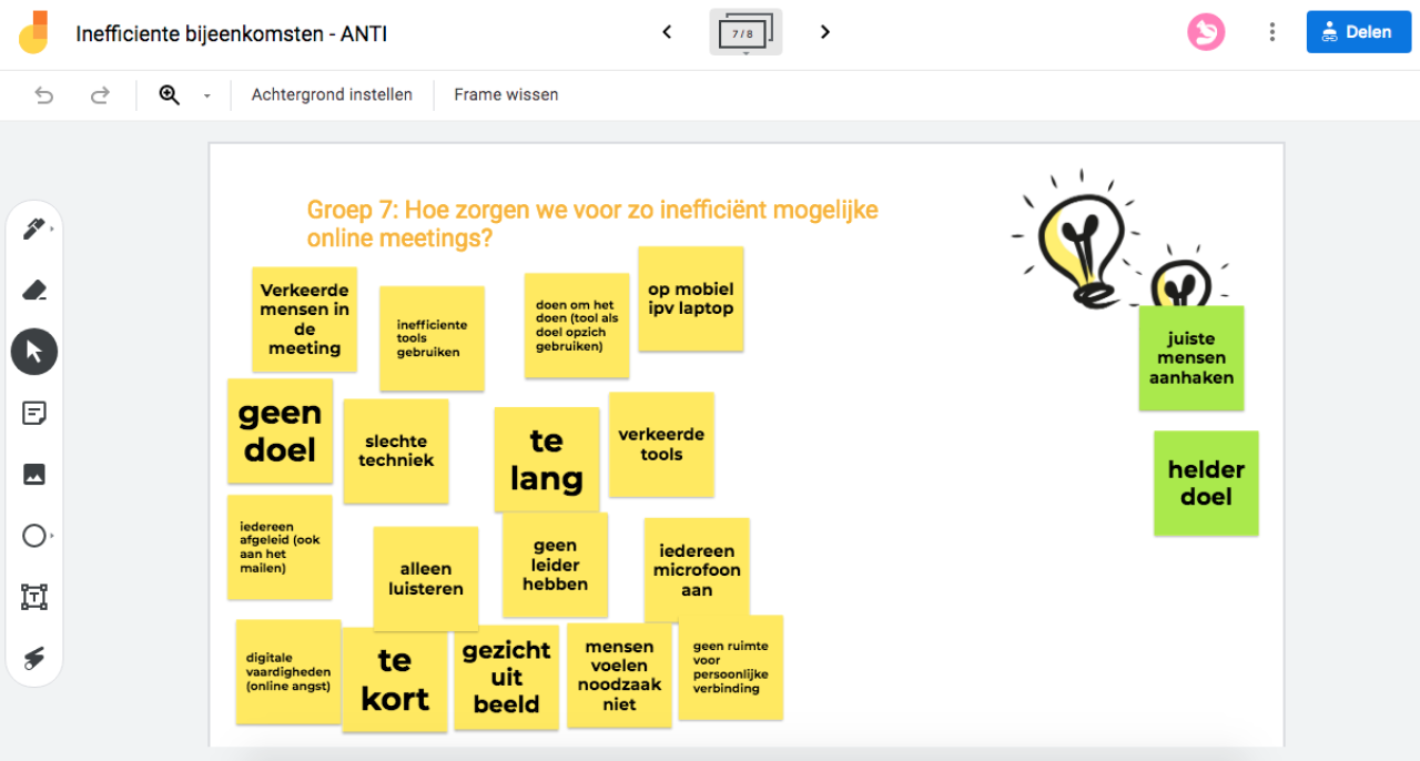 Het hangt van het doel van je sessie af welke tool prettig is. Wil je de old school flip-over met post-its imiteren, dan is jamboard het makkelijkst om te gebruiken. Zeker voor het werken in kleinere groepjes is jamboard fijn en overzichtelijk. Jamboard maakt het gewoon niet moeilijker dan het is!